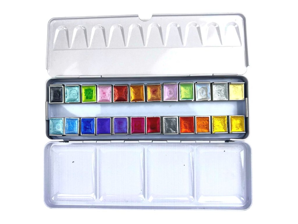 Kromě svých vlastností nabízejí naše perleťové akvarely také bohaté odstíny, které se jasně lesknou na papíře. Tyto barvy zachycují světlo a vytvářejí živé, třpytivé efekty, které dodají vašim uměleckým dílům jedinečnou atmosféru a hloubku.A nezapomeňme na jejich stylové balení. Naše perleťové akvarely jsou baleny v kovové krabičce a půlpánvičkách, což nejen dodává produktu luxusní vzhled, ale také zajišťuje, že budou vždy bezpečně uloženy a připraveny k použití.