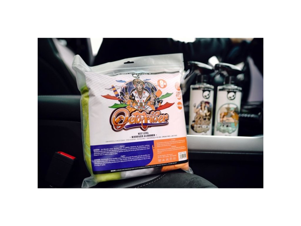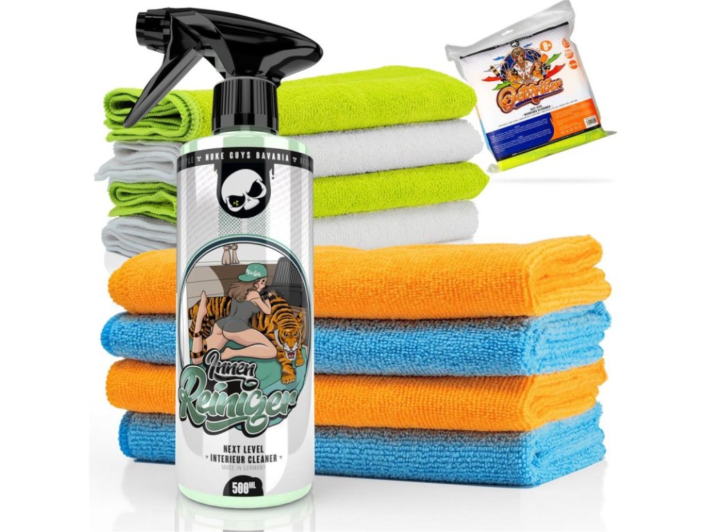 NUKE GUYS BAVARIA INNENREINIGER Interior Kit Sada obsahuje čistící prostředek na všechny interiérové povrchy a balení 8ks mikrovláknových utěrek.